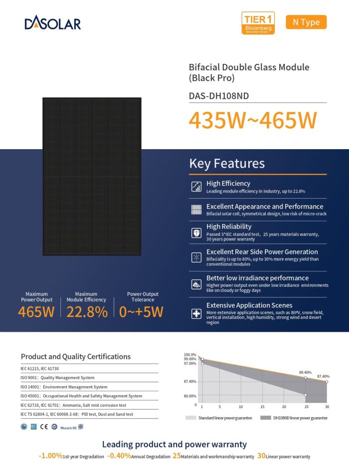 Le DH108ND 450 W combine haute densité de puissance, robustesse double verre et garanties longues, pour un LCOE réduit sur projets résidentiels & tertiaires.