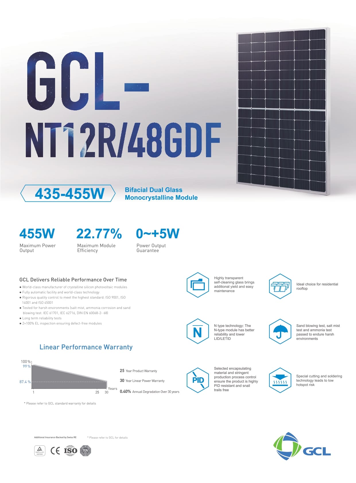 Le GCL NT12R/48GDF 450 W associe technologie N-Type, conception bifaciale et structure verre-verre pour offrir un module fiable et performant.