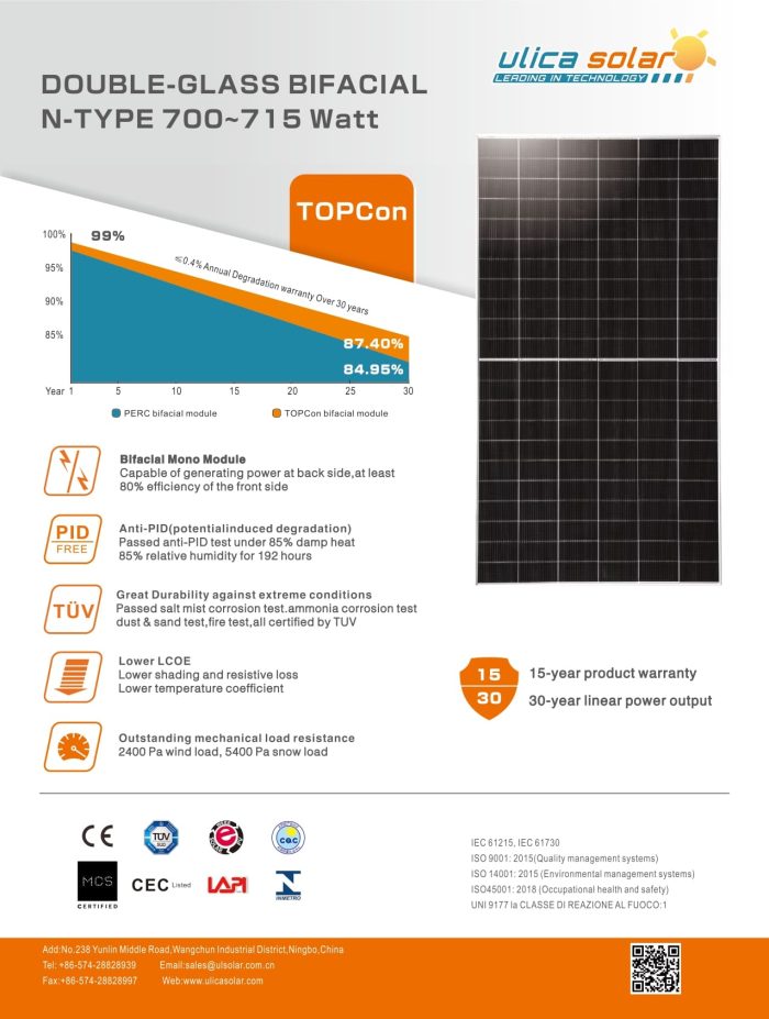 Le ULICA Solar UL-710M-132DGN constitue une solution photovoltaïque performante et durable, combinant haute puissance, technologie bifaciale avancée et robustesse mécanique, idéale pour les projets solaires professionnels de grande envergure.
